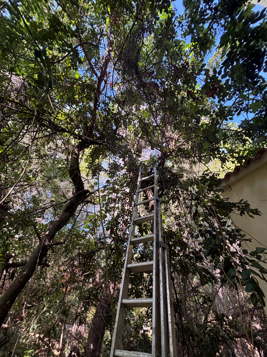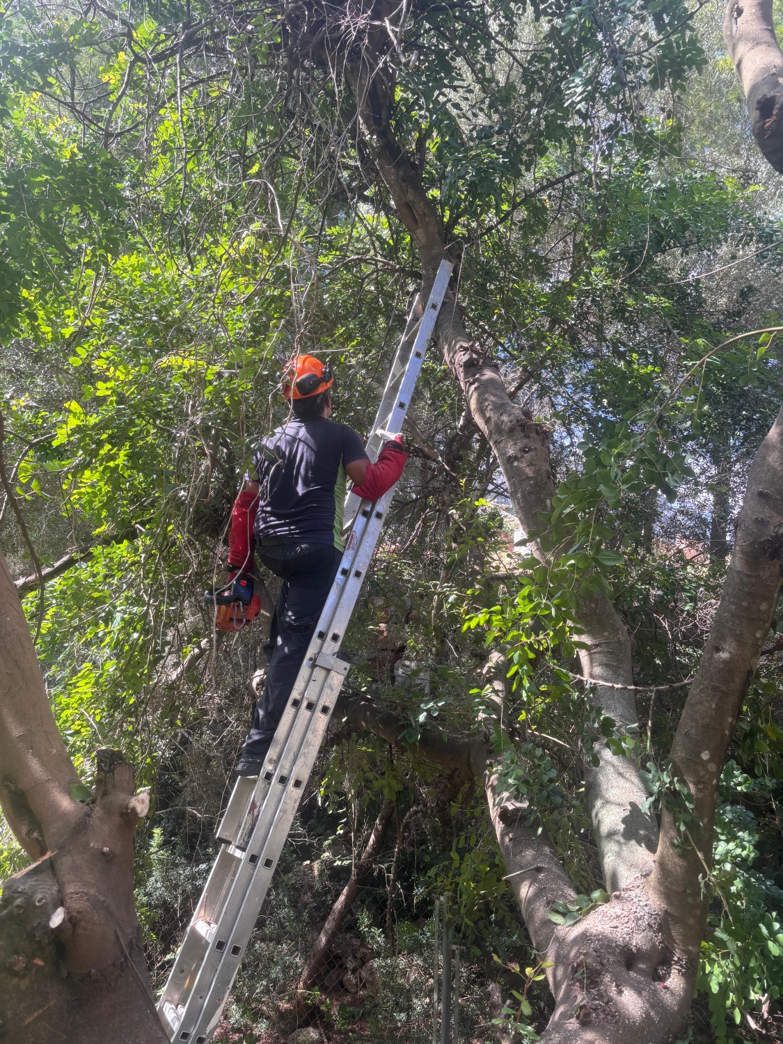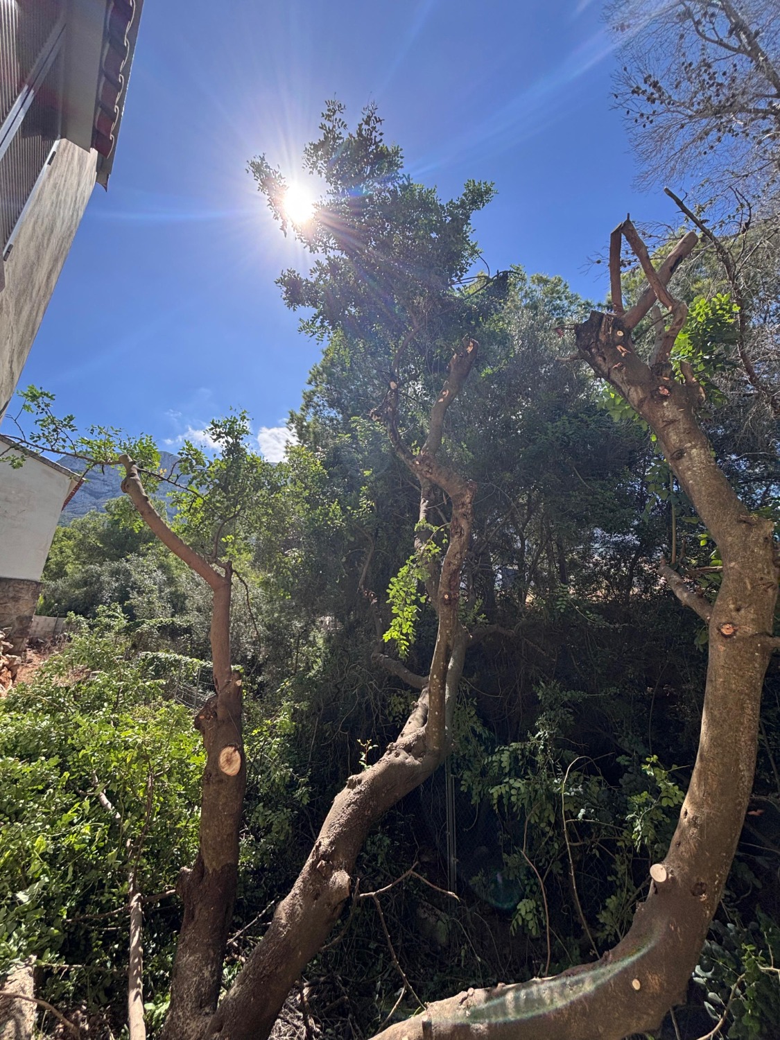 Carob (Ceratonia siliqua) The specimen showed a densified crown, with disordered branching, presence of dead wood and epicormic shoots. A health and training pruning was carried out, eliminating dry, crossed and poorly oriented branches, with the aim of recovering the natural architecture of the tree, improving the entry of light and promoting internal aeration. The intervention respected the characteristic shape of the carob tree, avoiding aggressive cuts and prioritizing the conservation of physiological balance.