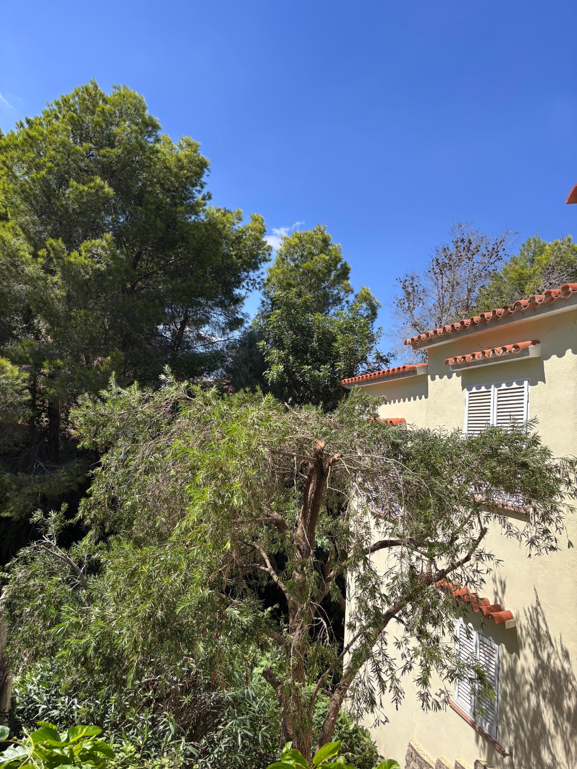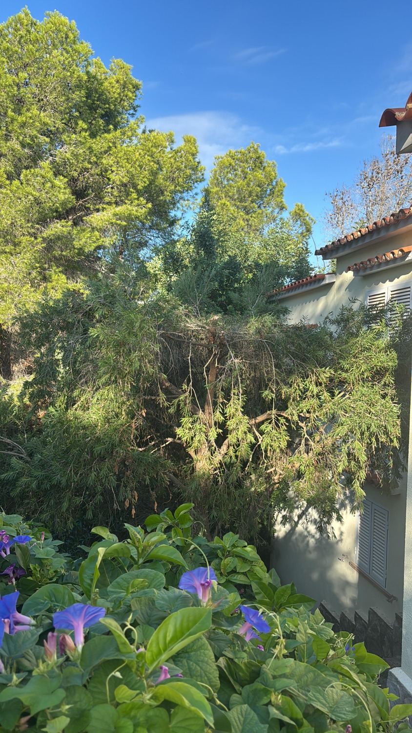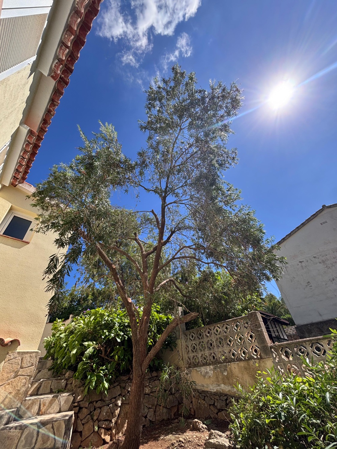 Carob (Ceratonia siliqua) The specimen showed a densified crown, with disordered branching, presence of dead wood and epicormic shoots. A health and training pruning was carried out, eliminating dry, crossed and poorly oriented branches, with the aim of recovering the natural architecture of the tree, improving the entry of light and promoting internal aeration. The intervention respected the characteristic shape of the carob tree, avoiding aggressive cuts and prioritizing the conservation of physiological balance.