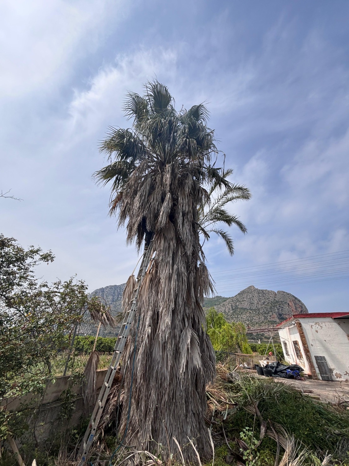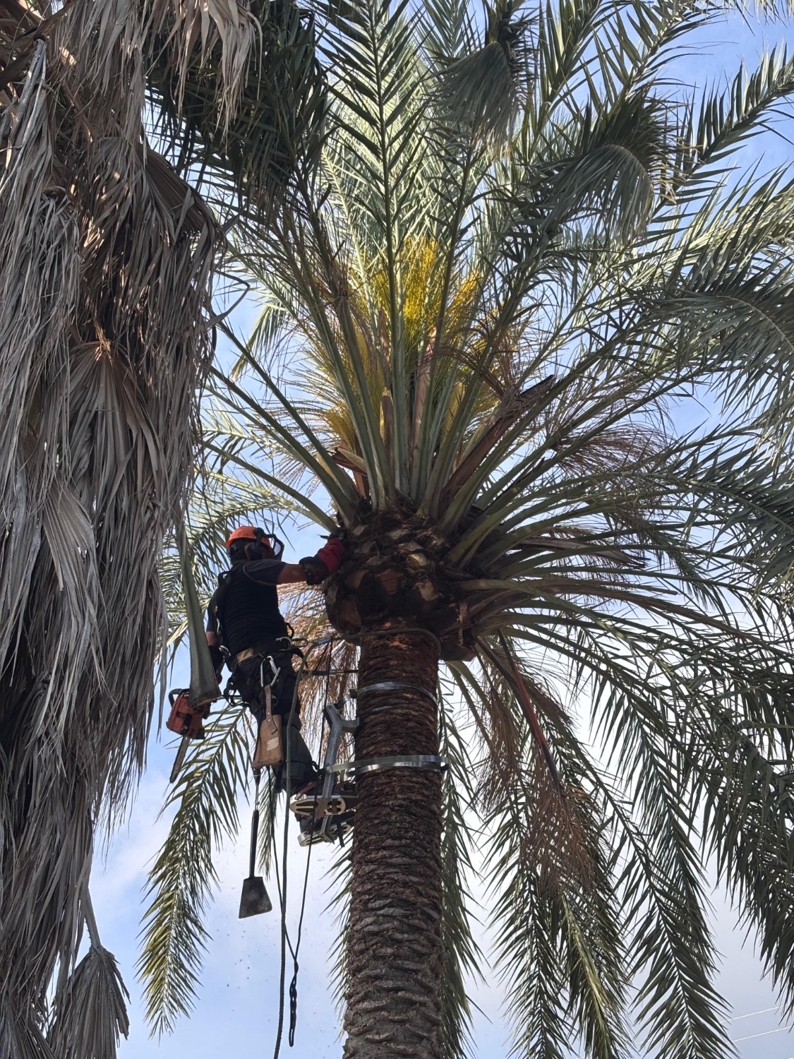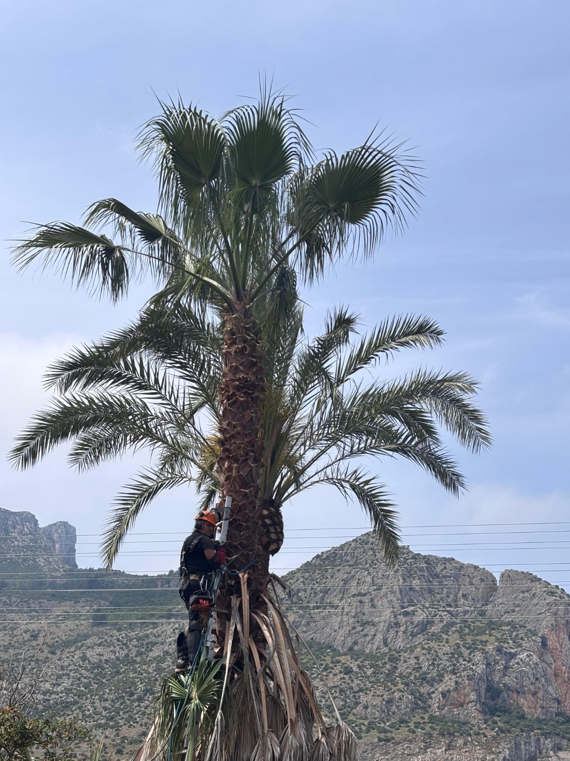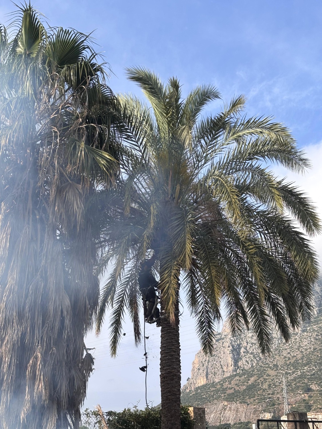 The work began with specialized pruning of a date palm (Phoenix dactylifera) and Washingtonia robusta, eliminating dry fronds and deteriorated elements to improve aesthetics, safety and plant health. Next, the olive and almond trees were pruned, applying renewal and training criteria to promote fruiting and optimize the crown structure.